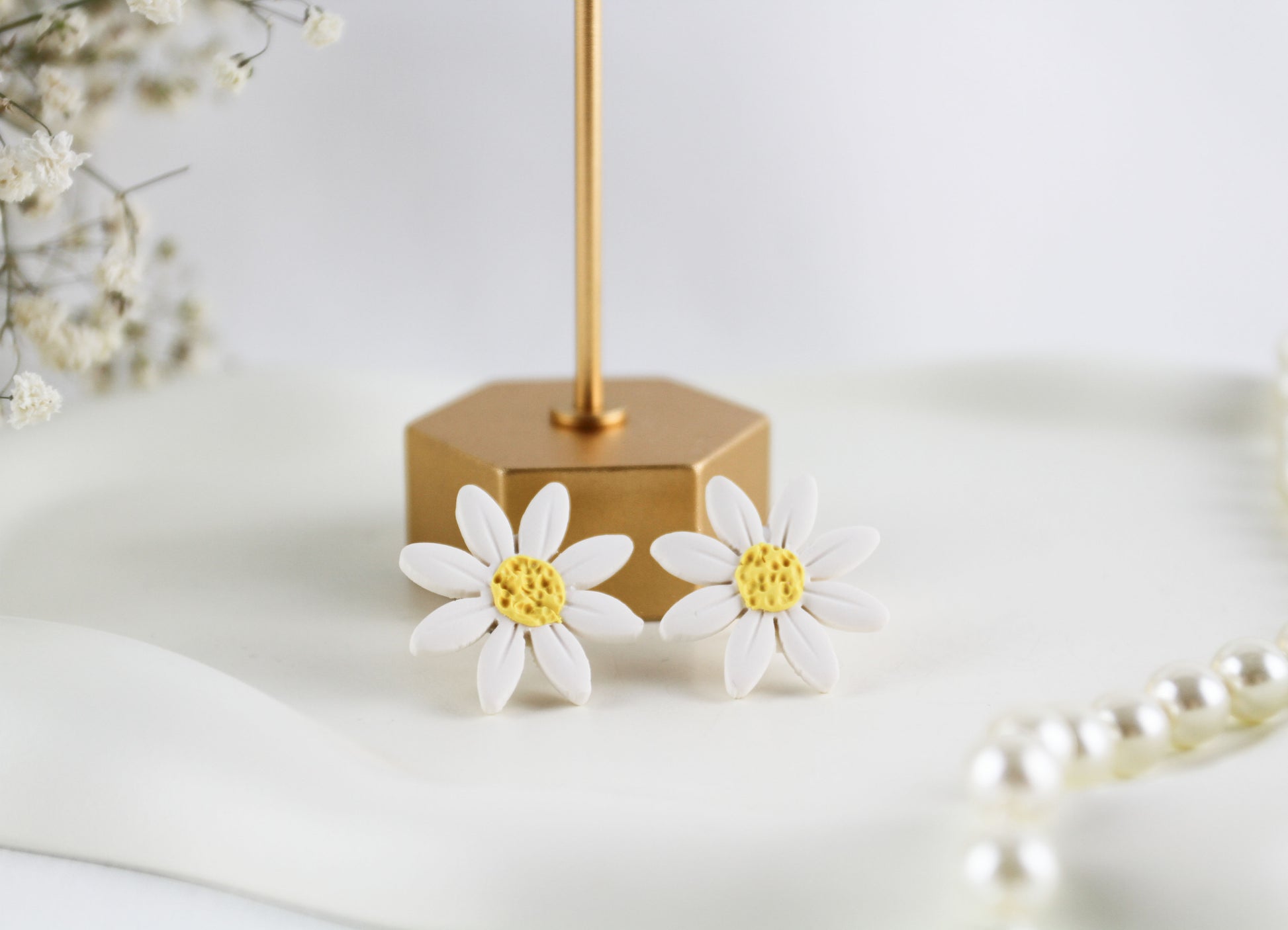 Weiße Daisy Blumen Creolen – Handgemachte Gänseblümchen Polymer Clay Ohrringe
